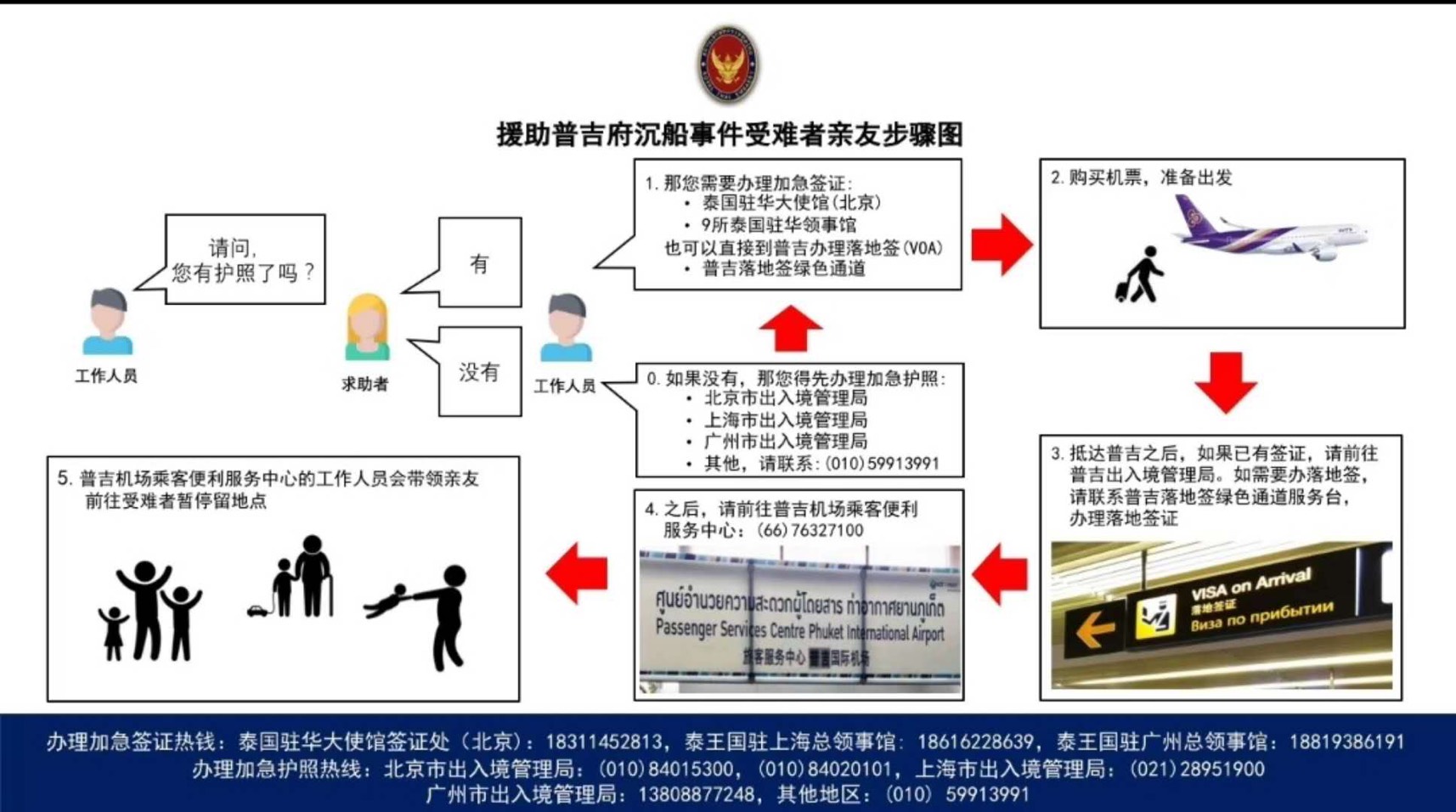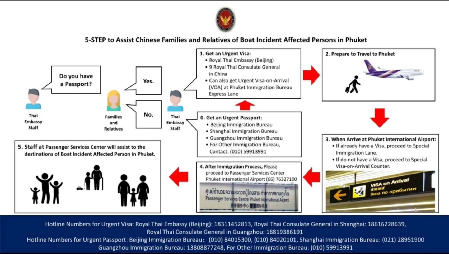- The Royal Thai Embassy in Beijing, Royal Thai Consulate General in Shanghai and Royal Thai Consulate General in Guangzhou are providing services for visa applications for the families and relatives of the affected tourists. See the graphic below for the five-step assistance procedures.
