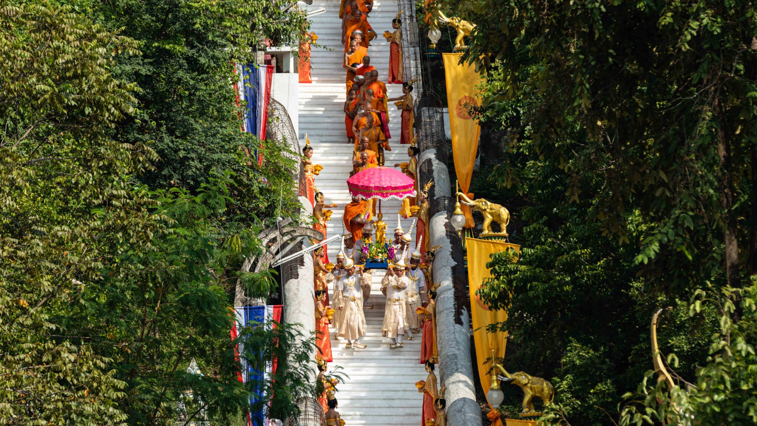 The day following Ok Phansa is often marked by a unique alms-giving ceremony known as Tak Bat Thewo (Receiving Alms for the Deva). In provinces like Uthai Thani, this ritual is an elaborate re-enactment of the Buddha’s celestial descent. Monks, often numbering in the hundreds, descend a decorated staircase from a hilltop shrine, symbolising the heavenly ladder, to receive alms from thousands of devotees lined up below. The spiritual intention is simple yet profound: to honour the Buddha’s return and make merit through the generosity of offering food. For participants, the atmosphere is one of serene devotion, a collective act of welcoming and veneration that reaffirms the central place of the Sangha (the monastic community) in their lives.