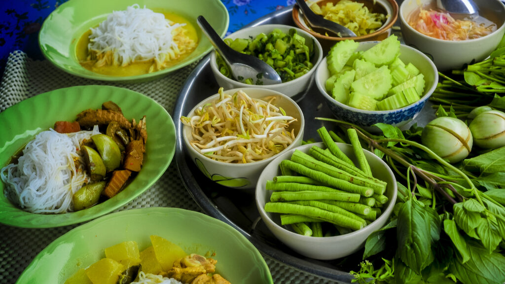 Thailand also shines on the world culinary stage with Michelin-recognised eateries and fine-dining restaurants. In Bangkok, the spectrum ranges from the legendary Jay Fai, internationally recognised for elevating Thai street food with a Michelin star, to contemporary Thai innovators like Le Du, alongside the refined artistry of R-Haan and Paste, both celebrated for reinterpreting royal and regional recipes. Beyond the capital, PRU in Phuket—Thailand’s first restaurant with a Michelin Green Star—champions farm-to-table dining rooted in sustainability. In Chiang Mai, Bib Gourmand-awarded street food stalls highlight northern favourites such as khao soi noodles and grilled meats, with Mae Hia Friday Market offering another glimpse of authentic regional cuisine recognised in the Michelin Guide.