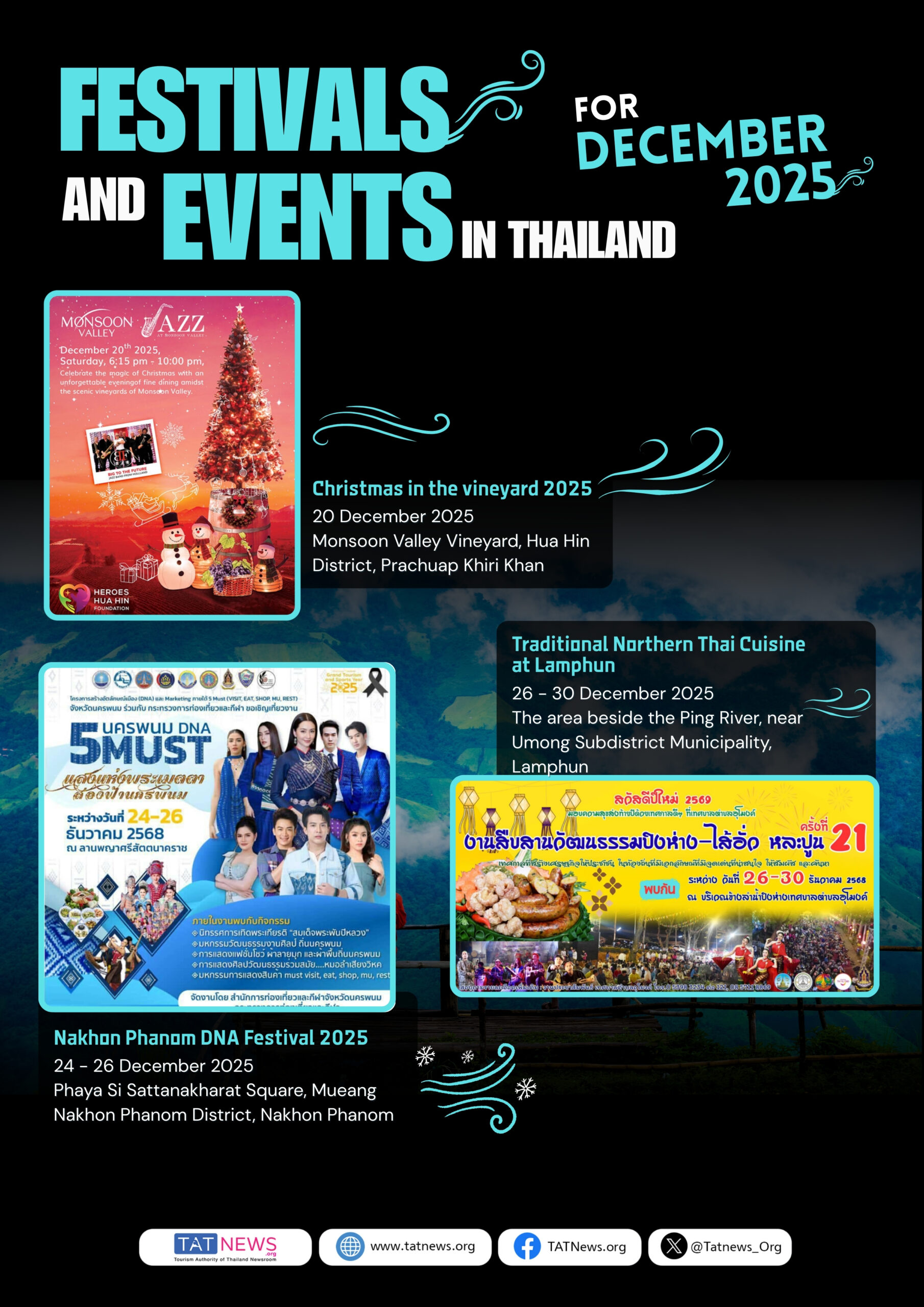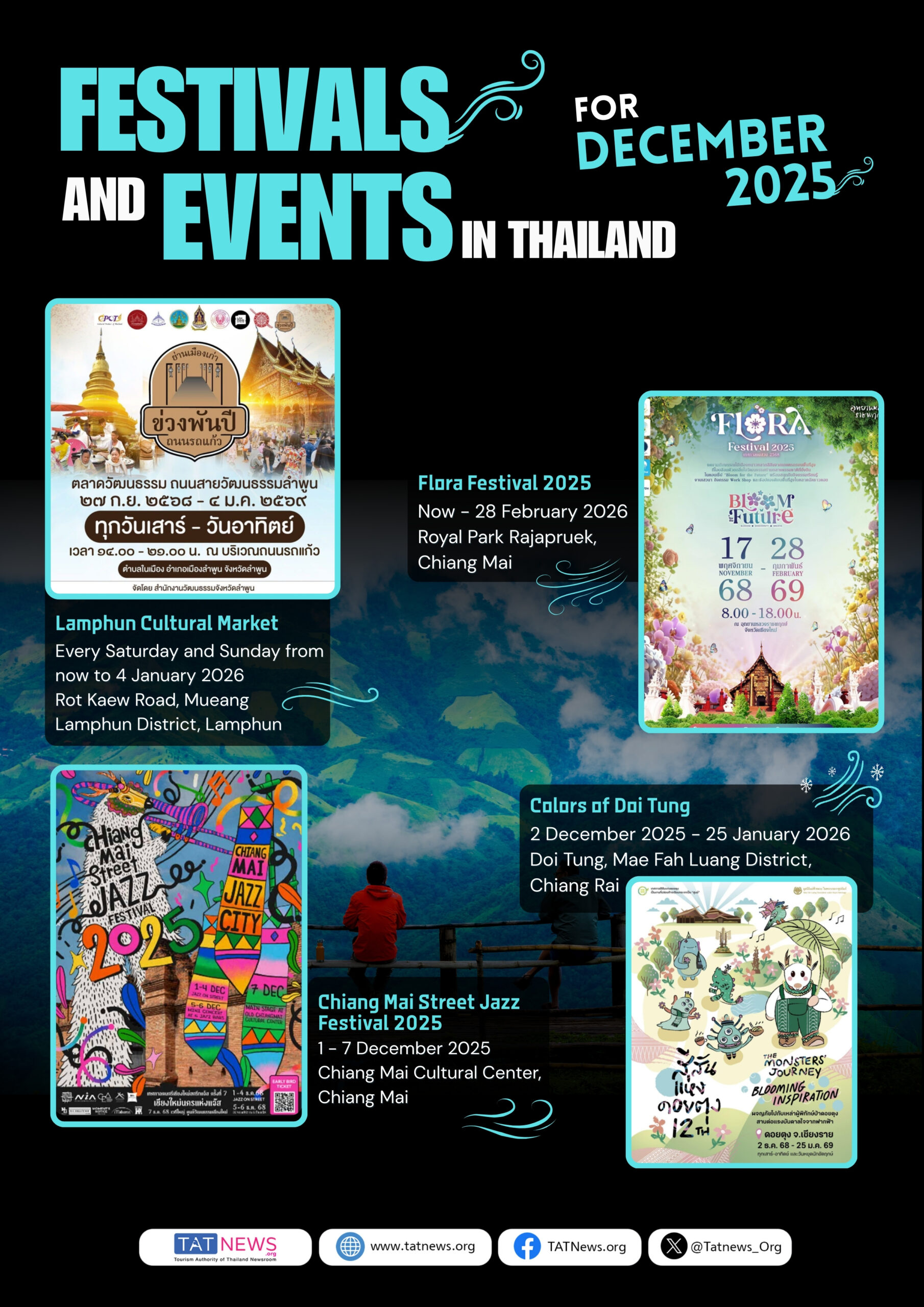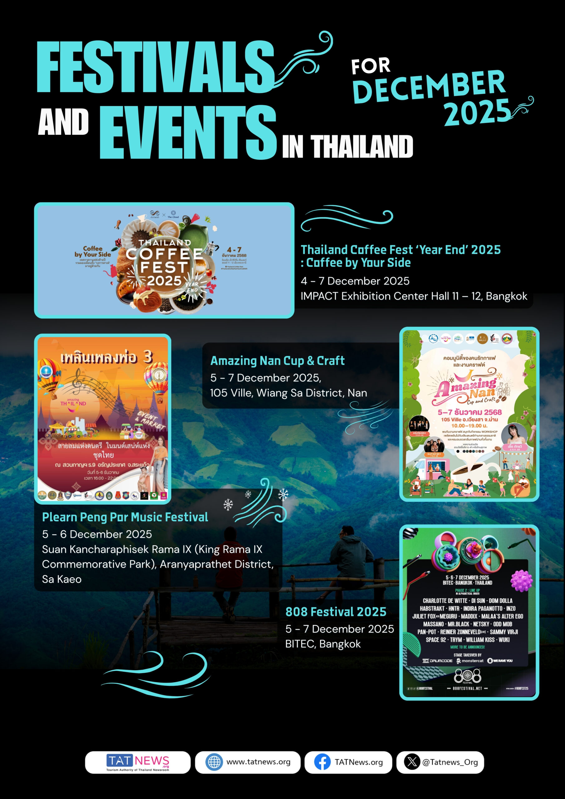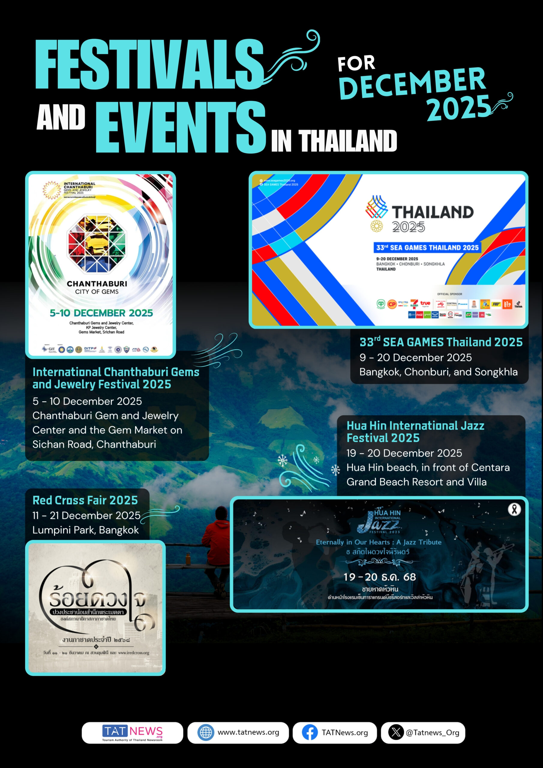 A month of celebration awaits. This December 2025 in Thailand, with an inspiring lineup of festivals and events, from Flora Festival 2025 and Colors of Doi Tung to the lively Chiang Mai Street Jazz Festival 2025 and beachfront Hua Hin International Jazz Festival 2025. Enjoy nationwide highlights including Thailand Coffee Fest ‘Year End’ 2025, 808 Festival 2025, the International Chanthaburi Gems and Jewelry Festival 2025, and experience the excitement of the 33rd SEA Games Thailand 2025, along with cultural showcases such as the Lamphun Cultural Market, Nakhon Phanom DNA Festival 2025, and more.